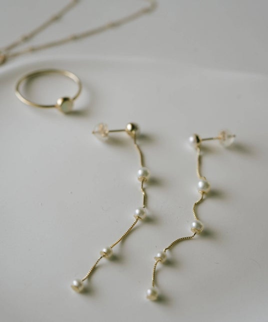エレガントなデザインと優雅な動きが魅力の、新作ジュエリーが登場。柔らかい乳白色の煌めきを放つ淡水パールが繊細なチェーンと合わさり、耳元で軽やかに揺れることで、シンプルなスタイルに華やかさと特別感をプラスします。
