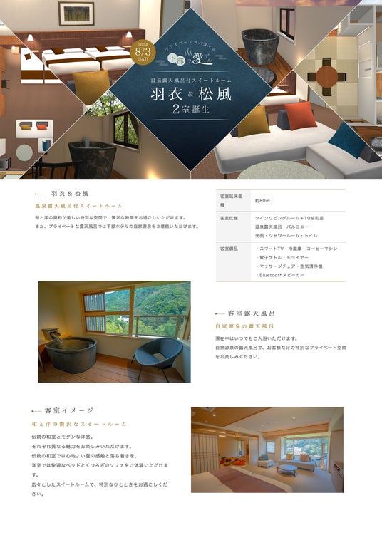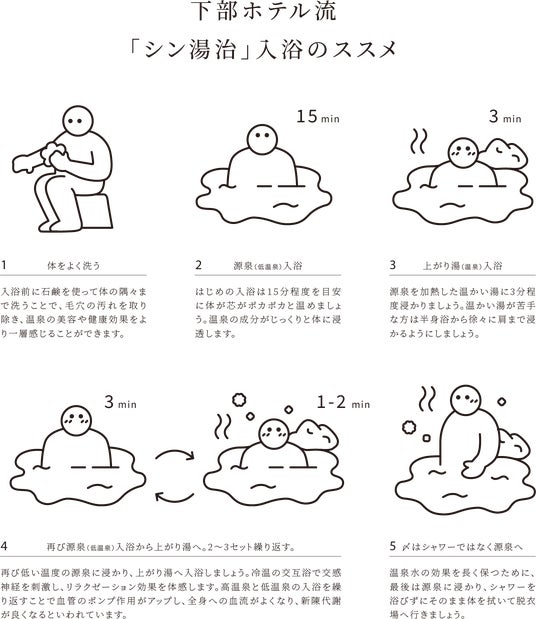 本プランは創設(95年)以来、初となる温泉露天風呂付きスイートルーム「羽衣」・「松風」の誕生に合わせて、下部ホテルの魅力を発信する取り組みの一つです。下部温泉郷は甲斐の名将・武田信玄公の隠し湯として知られる温泉地で、下部ホテルにはかつての名優、石原裕次郎さんも療養のために訪れた湯治の聖地です。今回、歴史ある”回復”の地である下部ホテルの魅力を最大限に味わえる「リカバリー」をコンセプトに、新たな湯治の概念として単なる入浴だけでなく、湯治の前後を含めた一連のリカバリープロセスを「シン湯治」と定義し、プランを新たにつくりました。多忙を極める現代人のライフスタイルに適応させた短期間で”湯治”の効果を最大限に引き出すプランです。