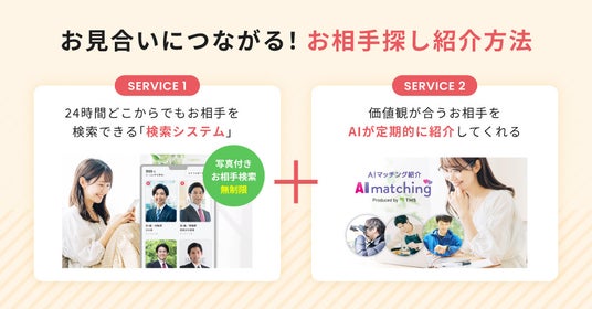 24時間どこからでもお相手を検索できる「検索システム」、価値観が合うお相手をAIが定期的に紹介してくれる「AIマッチング紹介」、出会いの幅が広がる担当者からの「推薦紹介」でお相手探しをすることができます。