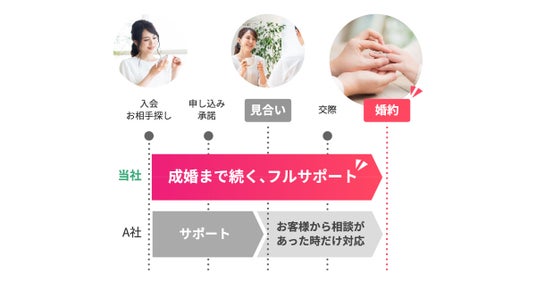 結婚相談所によっては「お見合い」でお相手と出会えた段階や「交際」から真剣交際できそうなパートナーに絞りこめた段階でサポートがなくなるところもあります。TMSパートナーは、お客様の成婚を第一に考え、入会から婚約に至るまで、フルサポート。お客様を成婚まで導きます。