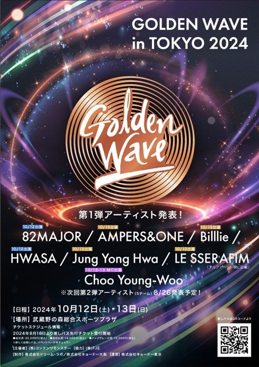 株式会社コンテンツモンスター(以下「当社」、本社:東京都港区、代表取締役社長 兼 COO チェ・ジョンファン)は、2024年10月12日(土)・13日(日)に開催される、Golden Wave in Tokyoの出演アーティスト第一弾を発表いたしました。