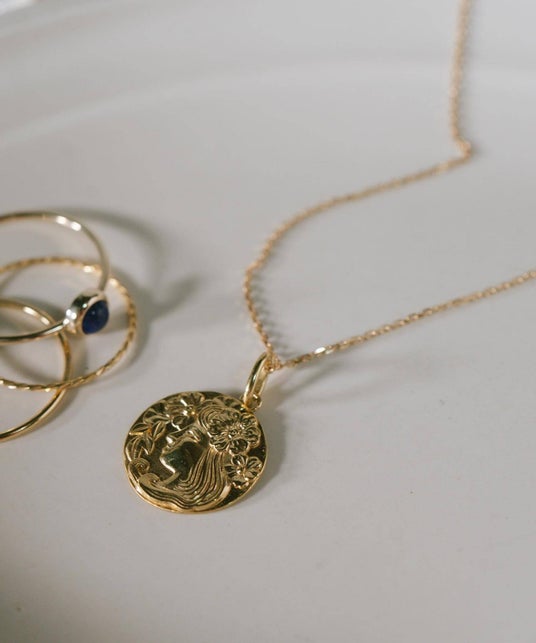 クラシックな美しさと現代的な洗練が融合したエレガントなコインネックレスが新登場。K10ゴールドのコインに精緻に彫刻された、ギリシャ神話に登場する「春と花の女神 フローラ」の姿が、自然の美しさと生命力を象徴しています。