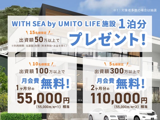 – 50万円以上出資した方の内、15名限定で『WITH SEA』施設1泊分の権利をプレゼント
