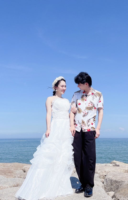 東海岸の絶景の海を背景にファッションショーウェディングコレクションの世界観で、モデル着用のウェディングドレス・アロハシャツのハワイスタイルのプレブライダル衣装で、大切な方と絶景の海で2人だけのプレブライダル!