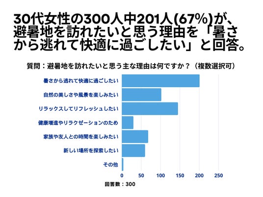 30代女性の300人を対象とした「避暑地を訪れたいと思う主な理由は何ですか?」というアンケートで201人(67%)が「暑さから逃れて快適に過ごしたい」という結果になりました。