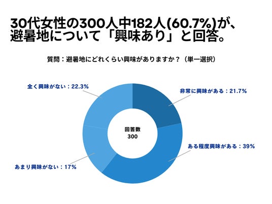 30代女性の300人を対象とした「避暑地にどれくらい興味がありますか?」というアンケートで182人(60.7%)が「避暑地について興味あり」という結果になりました。