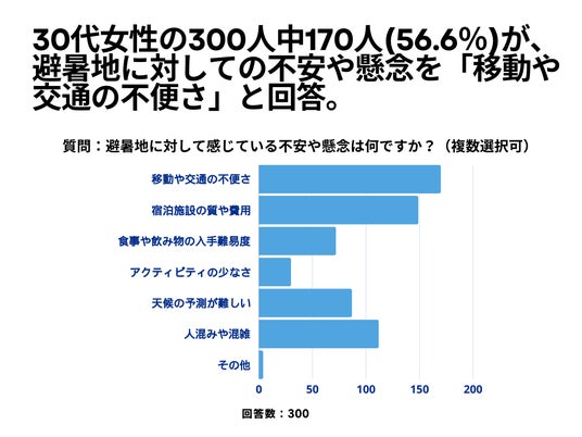 30代女性の300人を対象とした「避暑地に対して感じている不安や懸念は何ですか?」というアンケートで170人(56.6%)が「移動や交通の不便さ」という結果になりました。