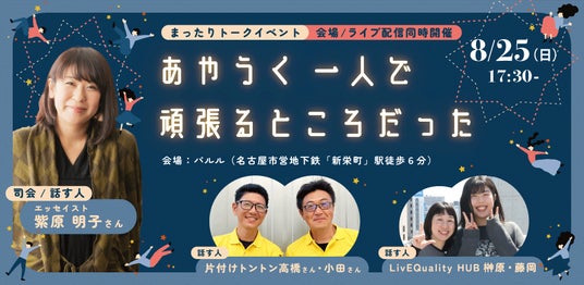 2024年8月25日 認定NPO法人LivEQuality HUB(リブクオリティ ハブ)は、エッセイスト紫原明子さん、「片付けトントン」さんをゲストにお招きして、名古屋でトークイベントを開催します。