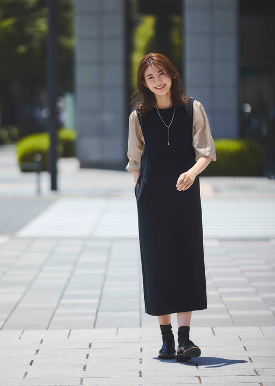 Jumperdress ¥27,940 Blouse ¥15,950 Necklace ¥6,050 Shoes ¥14,960 ※全て税込価格