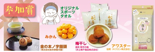 また、今年は参加賞としてオリジナルスポーツタオルやお風呂用ボディタオル(アワスター)、みかん、梅干し、金の本ノ字饅頭をご用意しています。