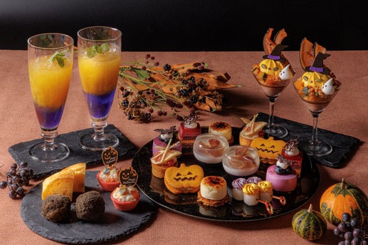 和と洋を取り入れたスイーツ7種には、こうもりチョコのオーナメントを飾ったココア生地とブルーベリーのムース、ほうじ茶風味のアーモンド生地にカスタードとフレッシュ無花果をのせたタルトや、秋の味覚の和栗のシブースト、紫芋とさつまいもの餡を絞ったお団子、カシスとオレンジが層になった秋らしい色合いのムースケーキ、かぼちゃのペーストとクリームチーズのクッキーサンド、ぶどうのジュレ・パンナコッタの層に巨峰と白ワインのジュレをのせたグラスデザートをご用意。