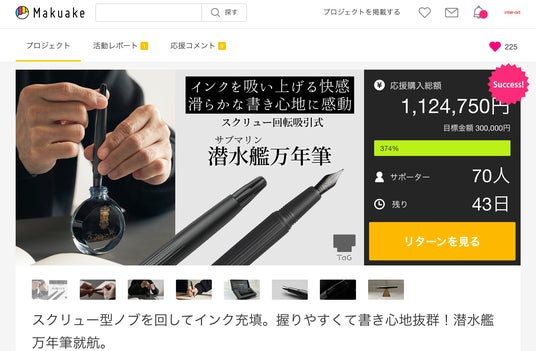 クラウドファンディングサイトMakuakeで「サブマリン万年筆」支援金額が目標を達成。
