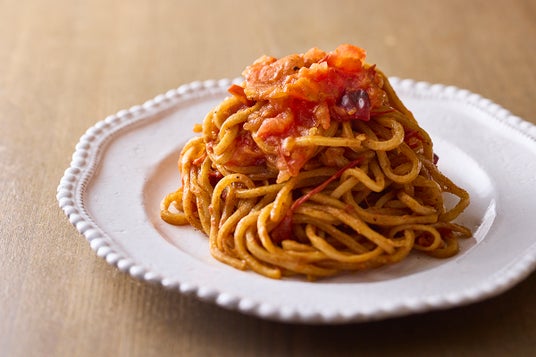 煮詰めたトマトの深みと唐辛子のキレが効いた焼きそば。仕上げにフレッシュなトマトを加えて完成。