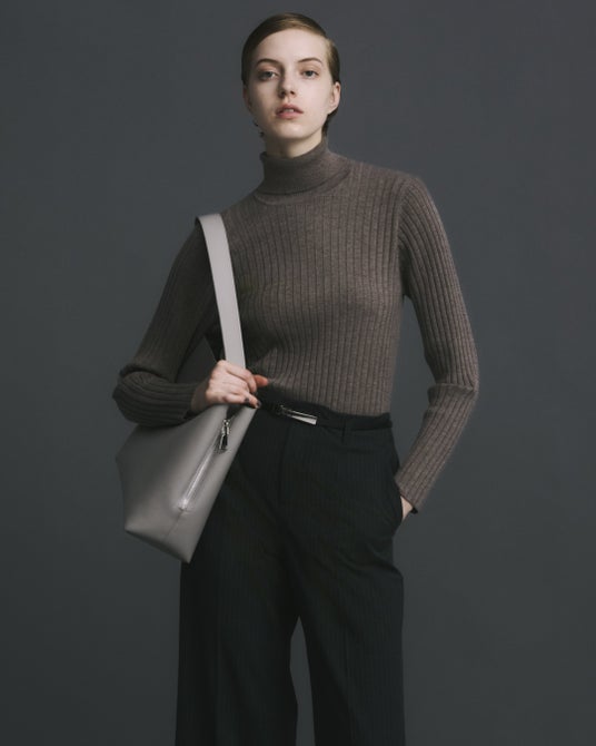 4. ワイドリブタートルネックニット、シンプルで着回しやすくボディラインに程良くフィットするサイズ感と肉感がポイント。衿を折り返してきちんと感のある着こなし、おらずにくしゅっとルーズにさせてこなれ感のある着こなしの両方が楽しめる仕様