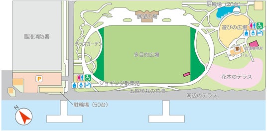 景色が綺麗な港の公園。東京2020大会では選手村の一部でもありました。噴水やカフェ、遊びの広場に加え、レインボーブリッジや臨海エリア・都心エリアを一望できる海辺のテラスもあります。また、正面入り口には大会レガシーとして銘板などがあります。レインボーブリッジを真近に見ることができる景色が美しい公園です。デートスポットとしてもおすすめで、官庁船バースに帆船が付くこともあり、東京港の景色が一層優雅に見えます。