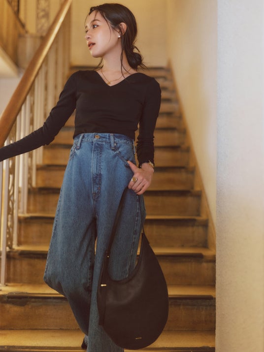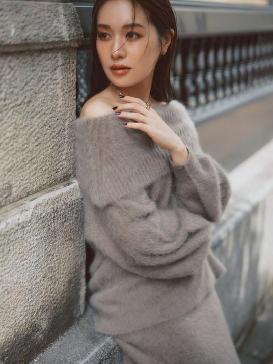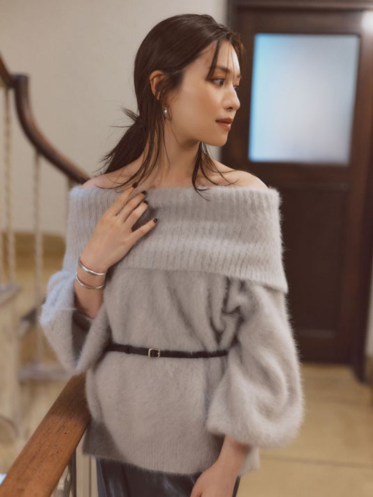 フォックス&カシミア混のオフショルダーニットは、今回のコラボの中でも個人的にいちおしのアイテム!包み込まれるようなふわふわの着心地で、上質な雰囲気たっぷりです。首から肩のラインが綺麗に見える上品なオフショルは、大人に最適。お尻が隠れるやや長めの着丈で、上からベルトをあしらってブラウジングしても素敵です。