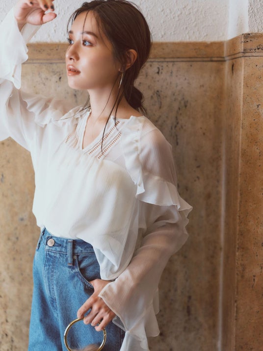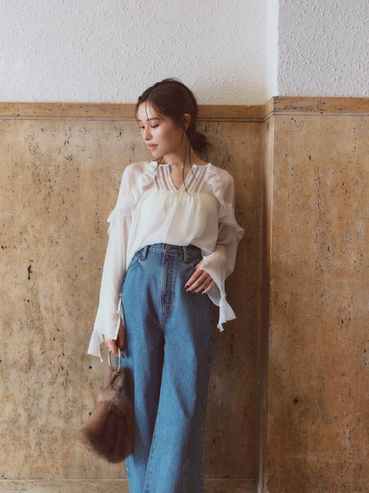 一枚で主役になれる、華やかブラウスが欲しくて。フリルがたっぷりあしらわれたフェミニンなデザインですが、透け感のある楊柳生地を使用しているので重く見えず、軽やかに着られます。袖の内側のくるみボタンを外せば、袖がふわっと広がってケープのような雰囲気に。デニムでカジュアルダウンしても可愛いです。