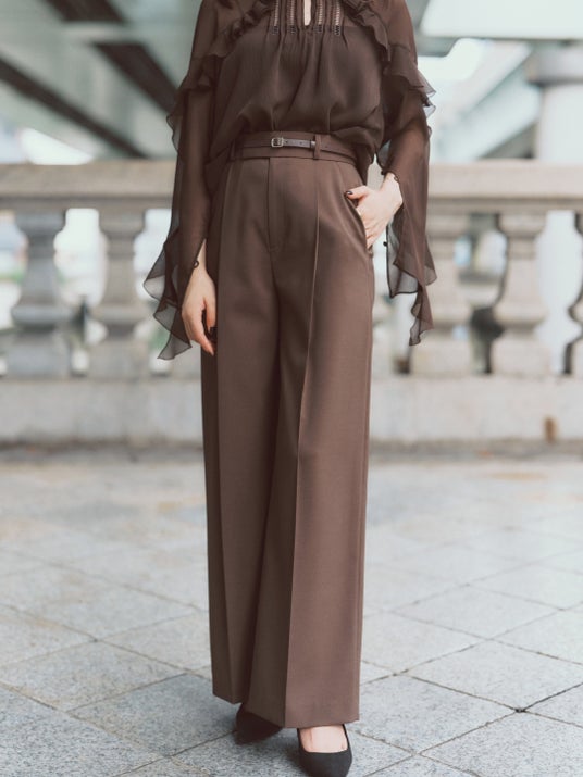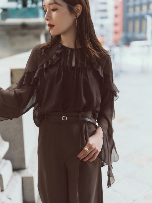 色違いで購入される方も多いというNOBLEの大人気美脚パンツを“ダークブラウン”で別注。深いブラウンのパンツは黒よりも柔らかく見え、エレガントにもカッコ良くも履きまわせて重宝すること間違いなしです。ブラウンの楊柳フリルブラウスと合わせてワントーンでまとめたコーディネートもおすすめ。