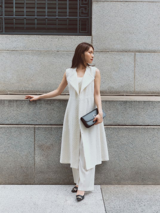 今年も流行継続中のツイードアイテム。今っぽい袖なしのツイードワンピースを作りました。前を開けてジレのように羽織ったり、前を閉めて同色のニットをインして長袖ワンピースのように着たり、様々な着こなしが楽しめます。襟や袖口のフリンジがこなれたアクセントに。すっきりとしたAラインのシルエットはスタイルアップ効果も!