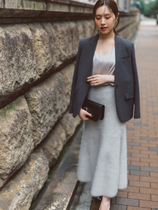 同素材のニットとセットアップでも着られるスカートは、女性の身体を美しく演出するマーメイドシルエット。腰まわりはすっきり見えつつ、歩くと裾がしなやかに揺れて、エレガントな雰囲気を高めてくれます。ふくらはぎを覆うロング丈、フォックスとカシミア混の生地でふんわり暖か。ロングブーツを合わせれば、本格的に寒い時期も活躍します。