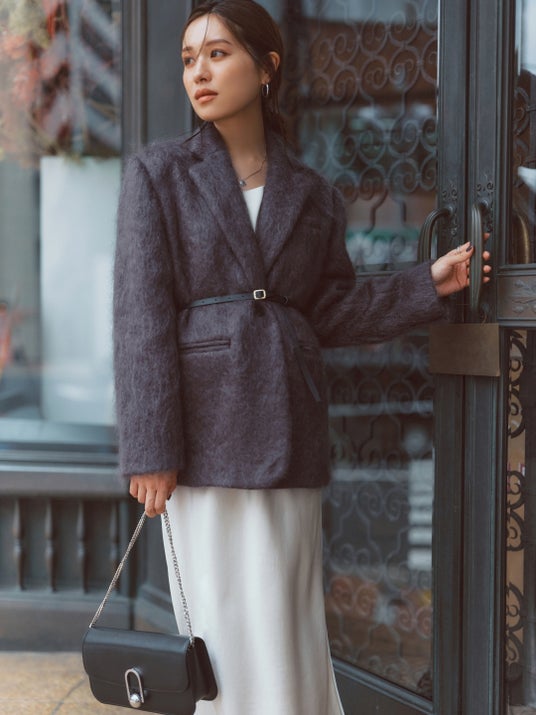 モヘアの起毛感が華やかなジャケットは、秋口から活躍すること間違いなし。あえてメンズライクなオーバーサイズに仕上げました。すとんとしたボクシーシルエットがこなれたムードを発揮してくれます。サテンのロングスカートやセンタープレスパンツなど、綺麗めなボトムスとも好相性!ベルトでウエストマークする着こなしもおすすめです。