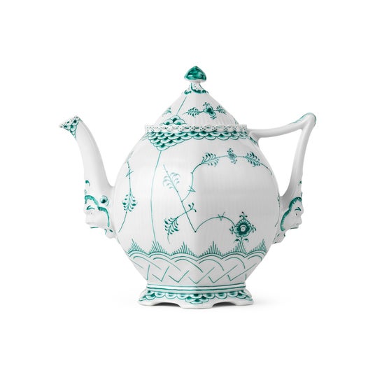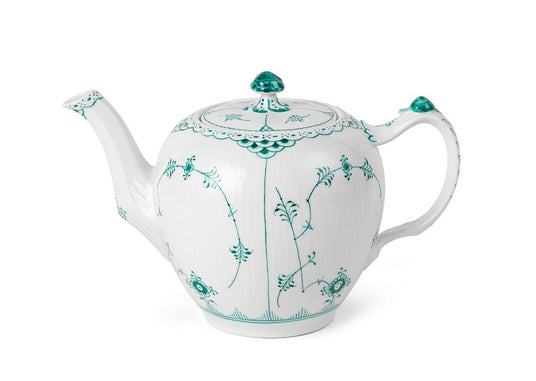 エメラルドグリーンフルーテッド ハーフレース ティーポットロイヤル コペンハーゲンの最もクラシックなシェイプが、紺碧のエメラルドグリーン色のハーフレース モチーフで彩られています。あなたのコレクションに加えたい永遠のクラシックな作品です。