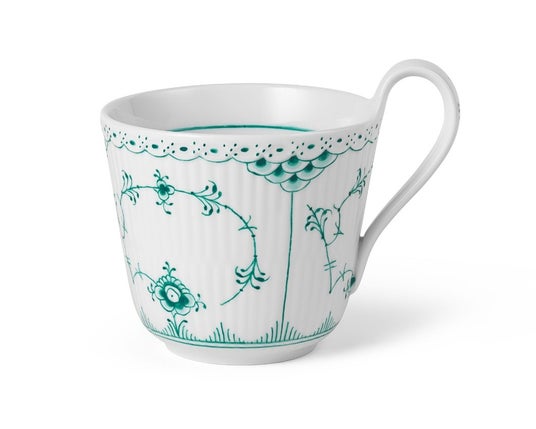 エメラルドグリーンフルーテッド ハーフレース ハイハンドルマグ見目麗しくかつ持ちやすい、人気の形状のハイハンドルカップに、鮮やかなエメラルドグリーン色のクラシックな装飾が クラシックなフォルムと融合し、一層エレガントに昇華されています。