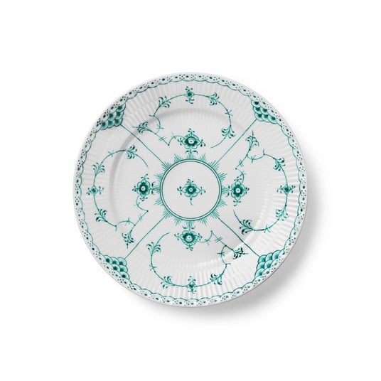 エメラルドグリーンフルーテッド ハーフレース プレート 22cmリムのあるクラシック形状をエメラルドグリーンフルーテッドハーフレースで美しく装飾した出番の多いサイズのプレートです。少量のお食事や、デセールの盛り付けにも最適で、夕方ダイニングシーンを演出する美しいキャンバスです。