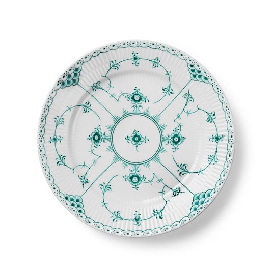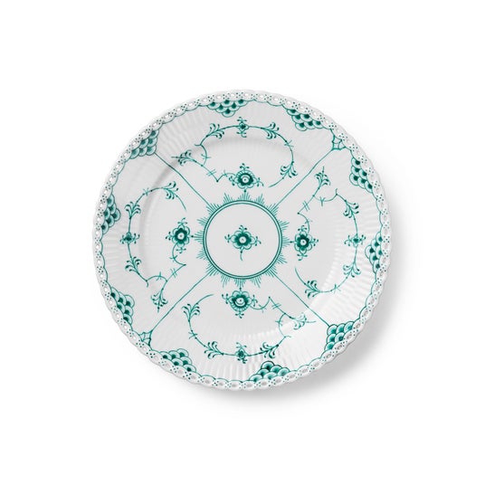 エメラルドグリーンフルーテッド フルレース プレート ダブルレースフルレース コレクションは1885年にアートディレクター アーノルド クローの手によりそのシェイプが確立されました。重厚なレースの縁取りを纏ったエメラルドグリーンのフルレースプレートは、幾何学的な形状と美しい透かし文様のような複雑で美しさ極まる縁取りで、どんなテーブルや食事のひと時にも見事な見せる逸品になります。