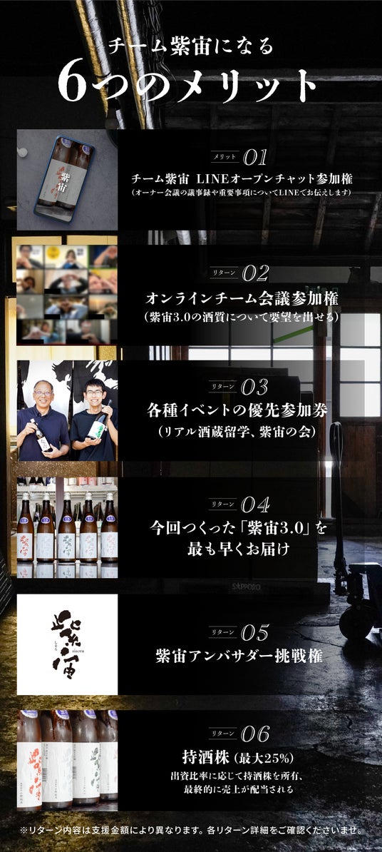 – いよいよ夢のお酒「紫宙3.0」が完成!オーナー向けのリターン品を先に発送します。