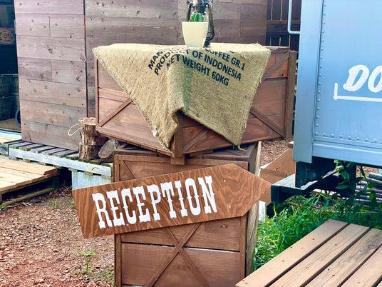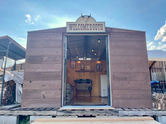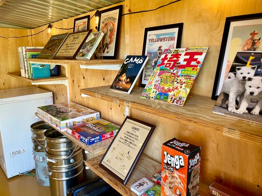 キャンプ場では珍しい、ホテルにあるようなウェルカムブースを設置。中ではウェルカムドリンクを楽しみつつ、あると便利な歯ブラシなどのアメニティ類、自由に読める図書コーナー、テントに持っていけるボードゲームなどのサービスが充実。