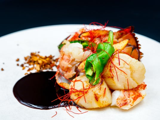 国産ホタテとロブスターのテールをソテーすることで旨みを閉じ込め、バルサミコ酢と甜麺醤のソースで仕上げました。