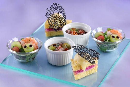 シャインマスカットと海老のサラダ レモン風味 / シャインマスカットとローストビーフのココット / パンプキンとロースハムのサンドウィッチ イカ墨のチュイル添え