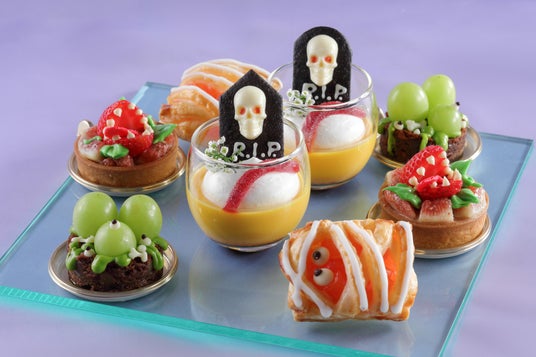 目玉が浮かぶぶどうのゼリーや墓場をイメージしたパンプキンプリンなどを高級フルーツ「シャインマスカット」や秋の味覚「いも・くり・なんきん」を使用し、カラフルでかわいいハロウィーンスイーツに仕上げました。クモの巣に見立てたチュイルや目玉が付いたシャインマスカットをあしらったハロウィーン仕様のセイボリーとともにお楽しみください。