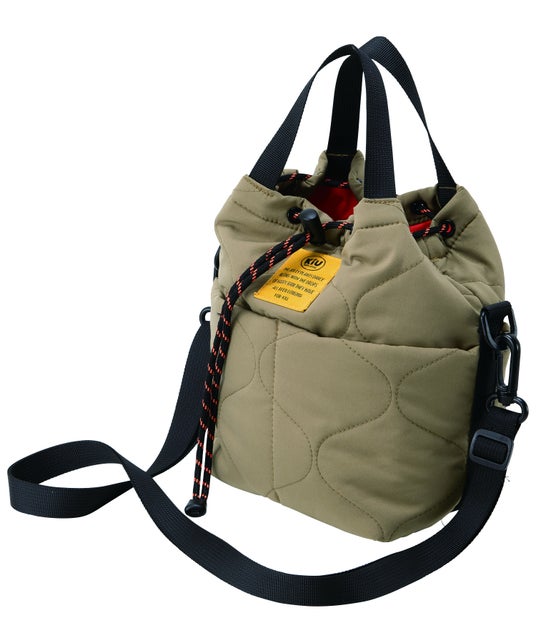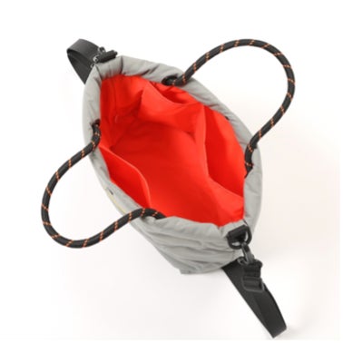 ・特徴: クッション性を兼ね備えたキルティング素材のトートバッグ。11インチのPCも収納可能で、手持ち部分は開き口にコードロープが繋がっており、引っ張ると丸みを帯びたシルエットに変化。内側は鮮やかなオレンジで統一。