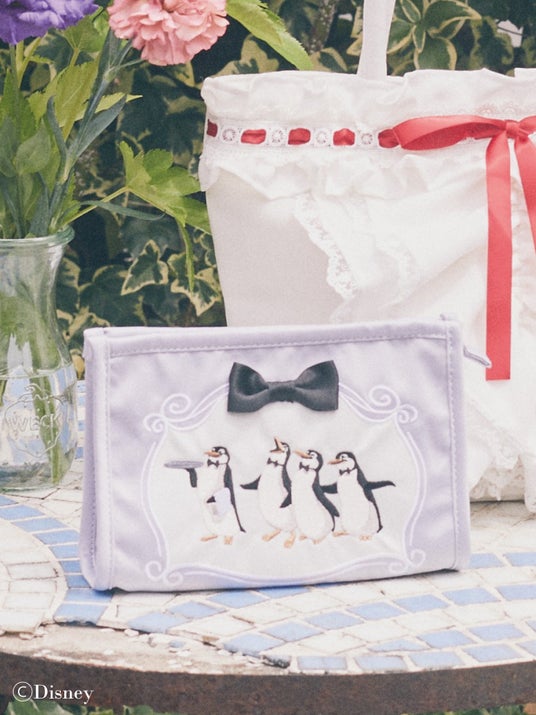 そのほか、「メリー・ポピンズ」が訪れるバンクス家のアートをゴールド箔プリントしたポーチや、作中に登場するペンギンのウェイターたちを刺繍であしらったスクエアポーチをラインアップ。どちらもブランドアイコンのリボンをプラスしました。