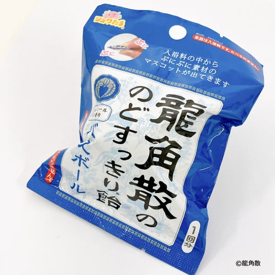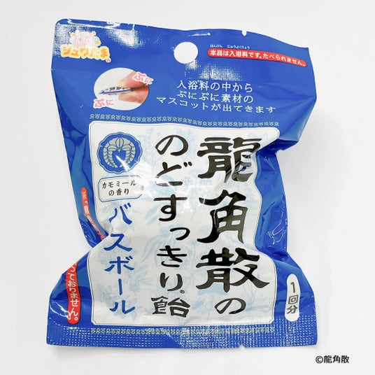 誰もが一度はお世話になったことがある(かもしれない) 「龍角散ののどすっきり飴」のデザインがバスボールに!カモミールが香るバスボールの中身はなんと、龍角散の商品パッケージのマスコット。マスコットはぷにぷにとした手触りが楽しめます♪