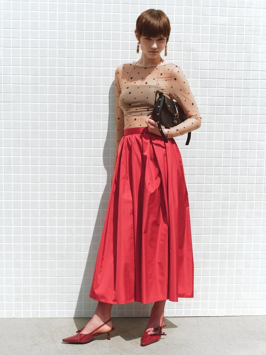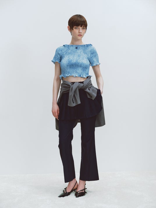 トラウザーとプリーツスカートの遊び心のあるレイヤリング