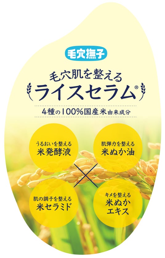 4種の100%国産米由来成分【ライスセラム】を配合。乾燥によりぽっかり開いた⽑⽳肌を、ふっくらもっちりさせる自然の恵みです。