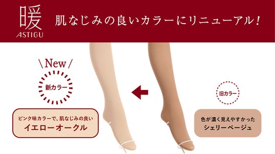 アツギ株式会社(本社:神奈川県海老名市、代表取締役社長:日光信二)は、プレーンストッキング・タイツの主力ブランド「ASTIGU/アスティーグ」の冬の定番タイツ【暖】のベージュカラーをトレンド感のある明るいベージュ「イエローオークル」にリニューアルいたします。新カラーの「イエローオークル」は、肌なじみが良く、自然な脚もとを演出します。店頭では8月下旬より順次展開いたします。