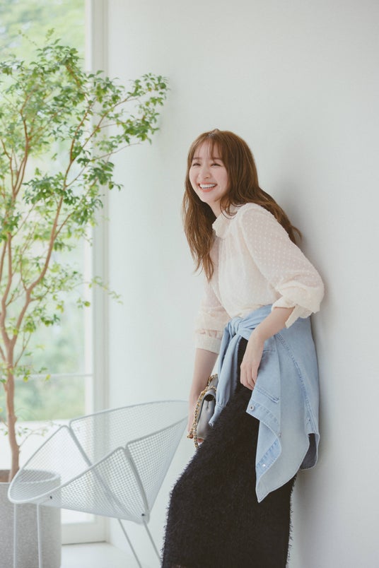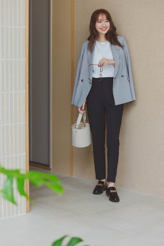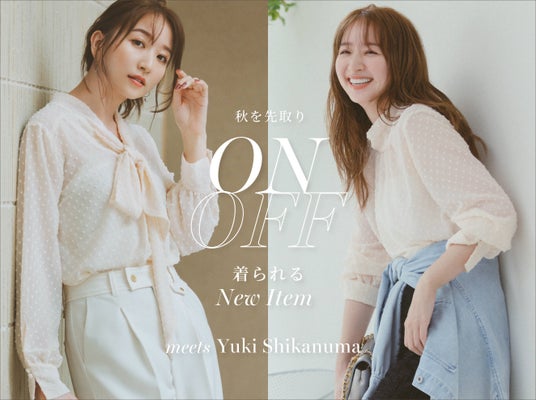 アクセサリー使いやヘアスタイルまでメリハリをきかせたオン・オフの着回しスタイルを、モデルの鹿沼憂妃さんが着こなします。