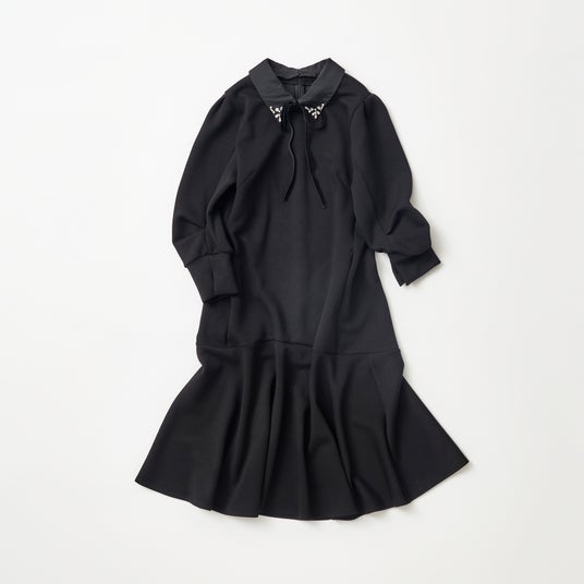 滑らかながらも程よくハリのあるダンボールニット素材のAラインワンピース。首元できらりと光るビジュー付きの襟と、華奢なベロアリボンが華やかなアクセントに。襟とリボンを取り外せば、シンプルシックな黒ワンピに。
