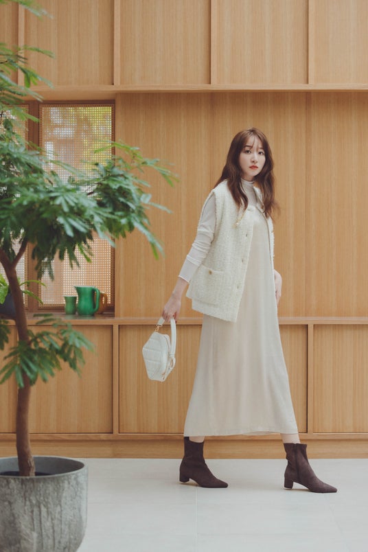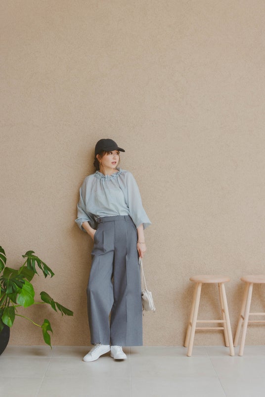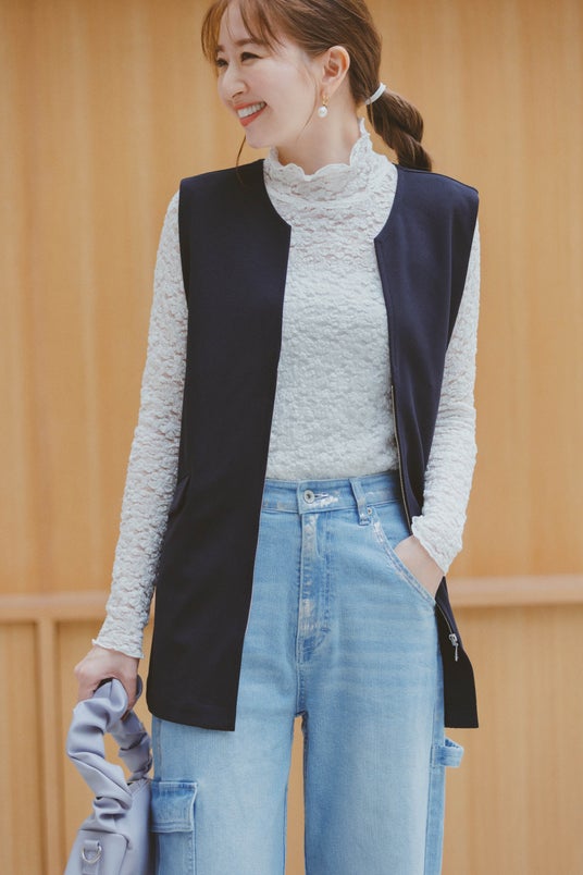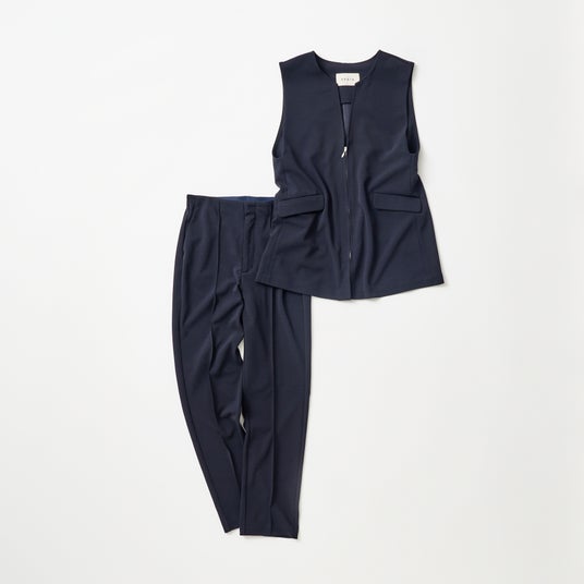 今季のトレンドのジレと、オールシーンで使える万能ボトム、テーパードパンツのセットアップ。ジレはジップアップデザインがクールで素敵。パンツのセンタープレス&ハイウエストデザインは美脚見え間違いナシ。