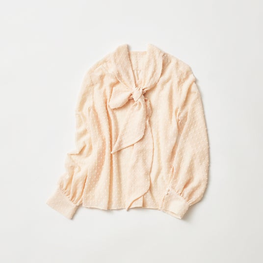 ぽこぽこと表面感のあるドットを一面に施したボウタイブラウス。落ち感のあるテクスチャー×エクリュカラーで気品たっぷりに。ほんのり肌が透ける素材は、女性らしさも十二分。ボウタイ面を後ろにしても着られる2WAYデザイン。