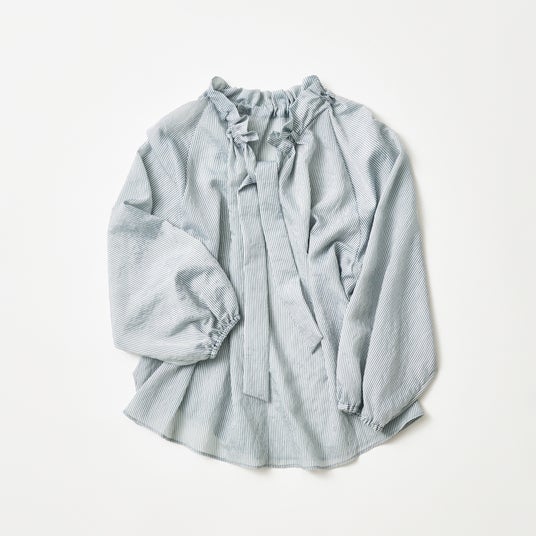 フリルのスタンドネックにボウタイリボン、ボリュームスリーブ…ぱっと着映えるディテールが自慢のブラウス。清潔感のあるブルーのピンストライプは好印象必至。前後で着られる2WAY仕様だから、シーンに合わせてアレンジを楽しめます。