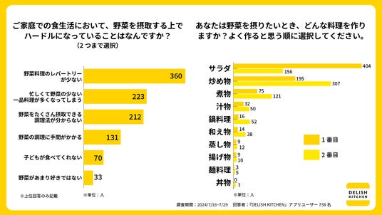 『DELISH KITCHEN』のアプリユーザー758人を対象に実施したアンケートでは、家庭での食生活で野菜を摂取する上でハードルになっていることについて、「野菜料理のレパートリーが少ない」「野菜をたくさん摂取できる調理法が分からない」など、レシピに関する課題が浮き彫りになりました。また、「野菜を摂りたいとき、どんな料理を作りますか?」という設問では、「サラダ」と「炒め物」に回答が集中し、野菜を活用した調理方法のバリエーションが限定的であることがわかりました。