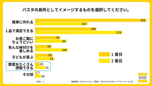 DELISH KITCHENでは、普段からもっと手軽に野菜料理を楽しんでいただけるよう、一品で野菜がとれる”ワンパンパスタ”のレシピを発信します。今回のアンケートで、パスタは月に1回以上食べる人が80%以上と非常に喫食頻度の高いメニューである一方、パスタのイメージとして「野菜をたくさん摂取できる」とのイメージはあまり定着していないこともわかりました。
