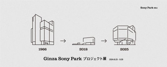 1966年開館のソニービルから2025年1月にグランドオープン予定のGinza Sony Parkへの継承と拡張のプロセス、そして1050日間の新築工事の記録を映像や写真で展示します。