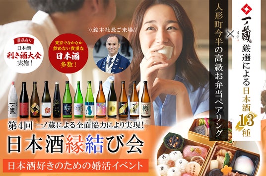 日本酒好きの独身者のための婚活イベントにて、一ノ蔵の日本酒ラインナップ13種類を取り揃えます。また、日本酒に合う肴として、人形町今半様による豪華折詰三段弁当をご用意。