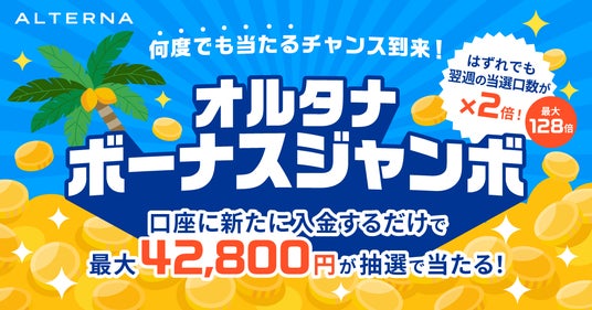 キャンペーン期間中にオルタナの口座に入金すると、抽選で毎週・最大42,800円が、何度でも当たります。